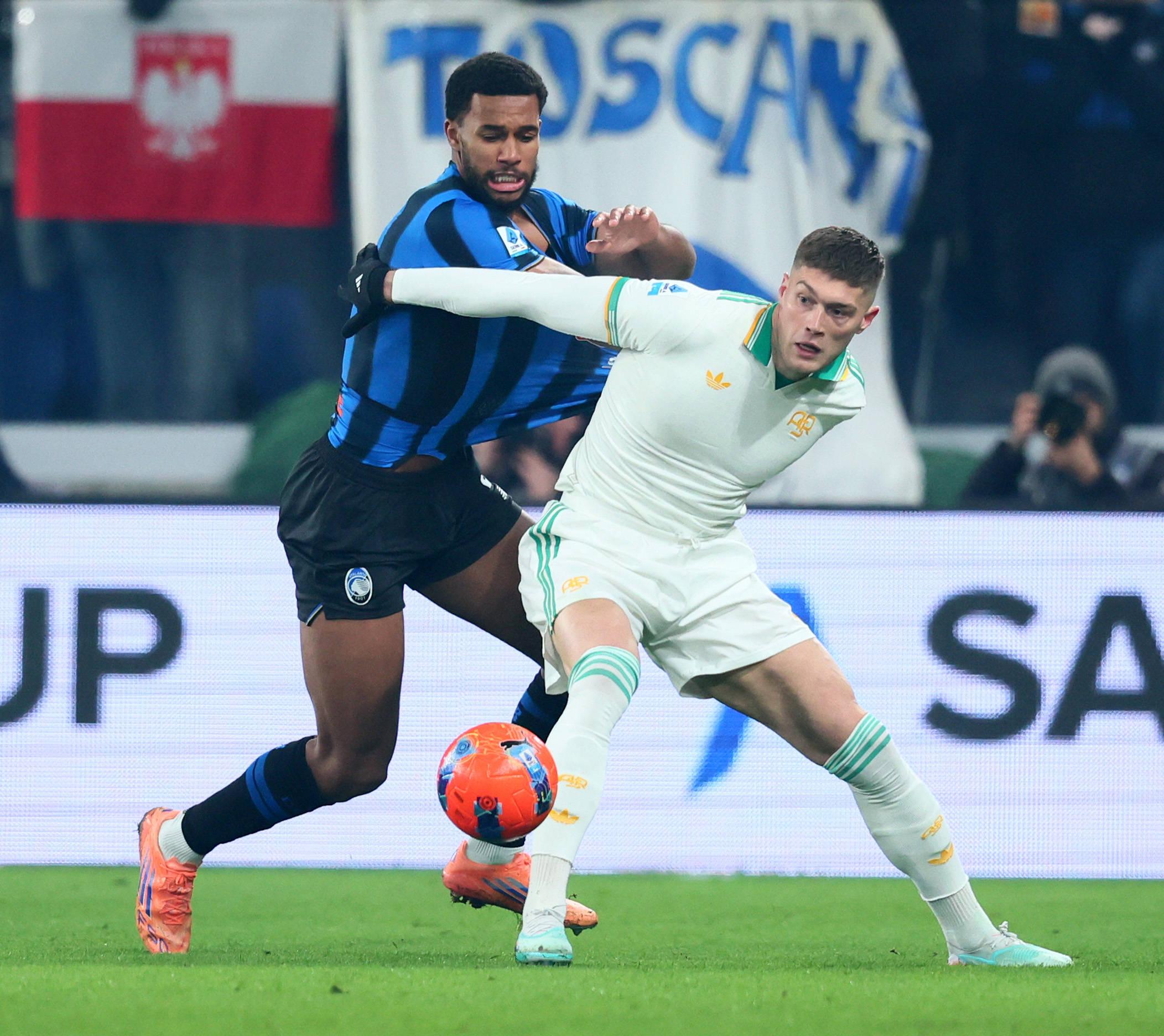 1月3日,亚特兰大队球员德凯特拉雷(左)与罗马队球员埃尔莫索在比赛中拼抢。 新华社发(阿尔贝托·林格利亚摄)