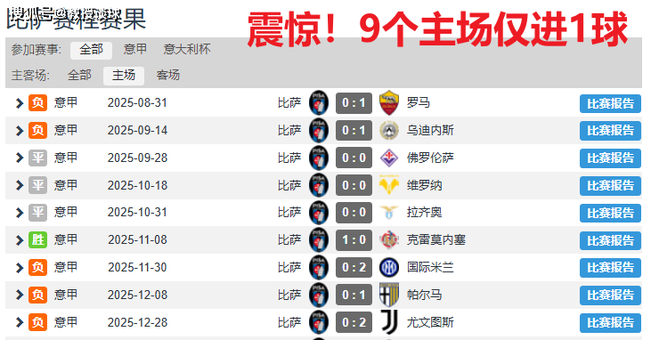 比萨:被诅咒的主场与破碎的信心