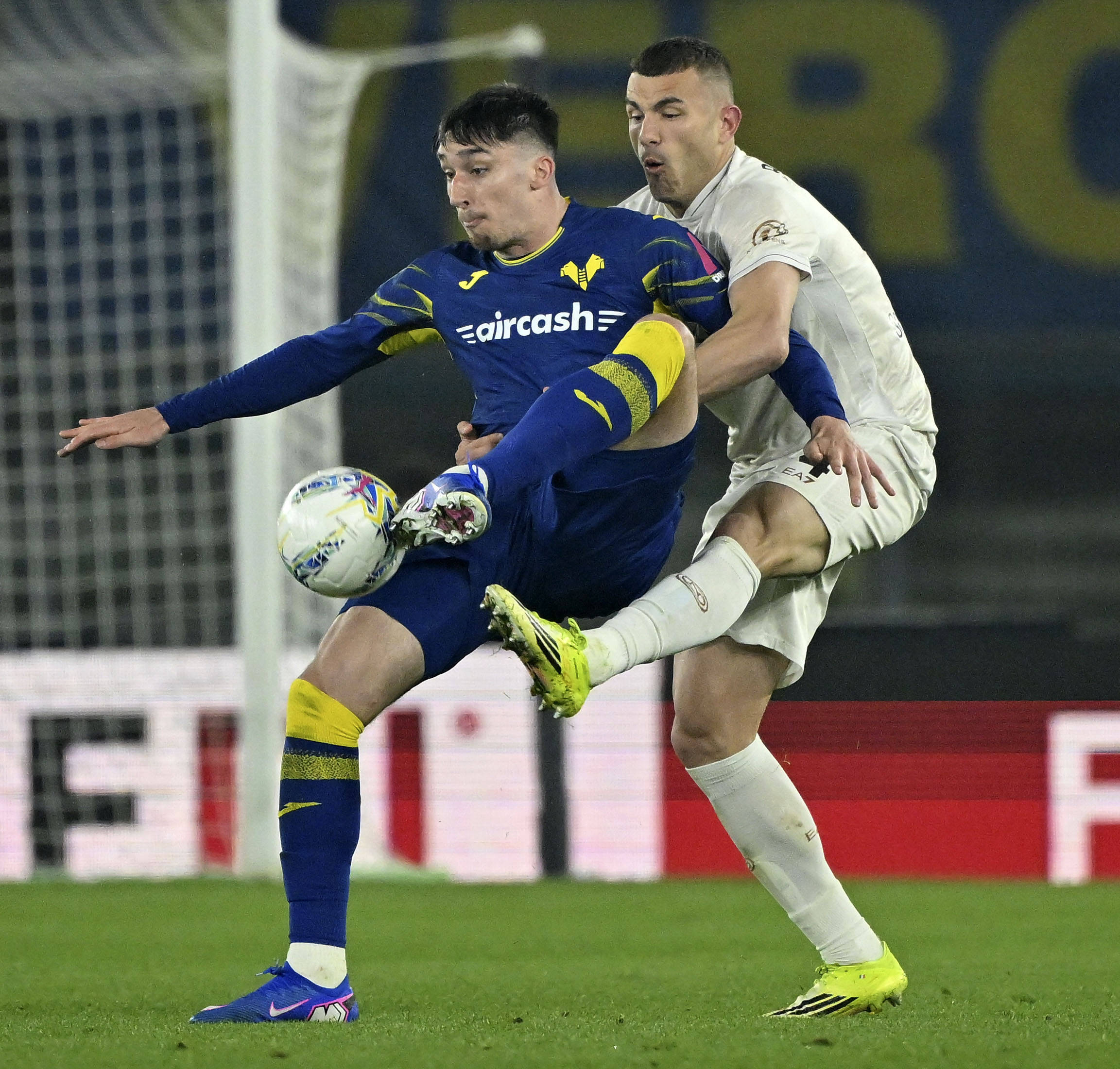 2月28日,那不勒斯队球员布翁焦尔诺(右)与维罗纳队球员鲍伊在比赛中拼抢。 新华社发(阿尔贝托·林格利亚摄)